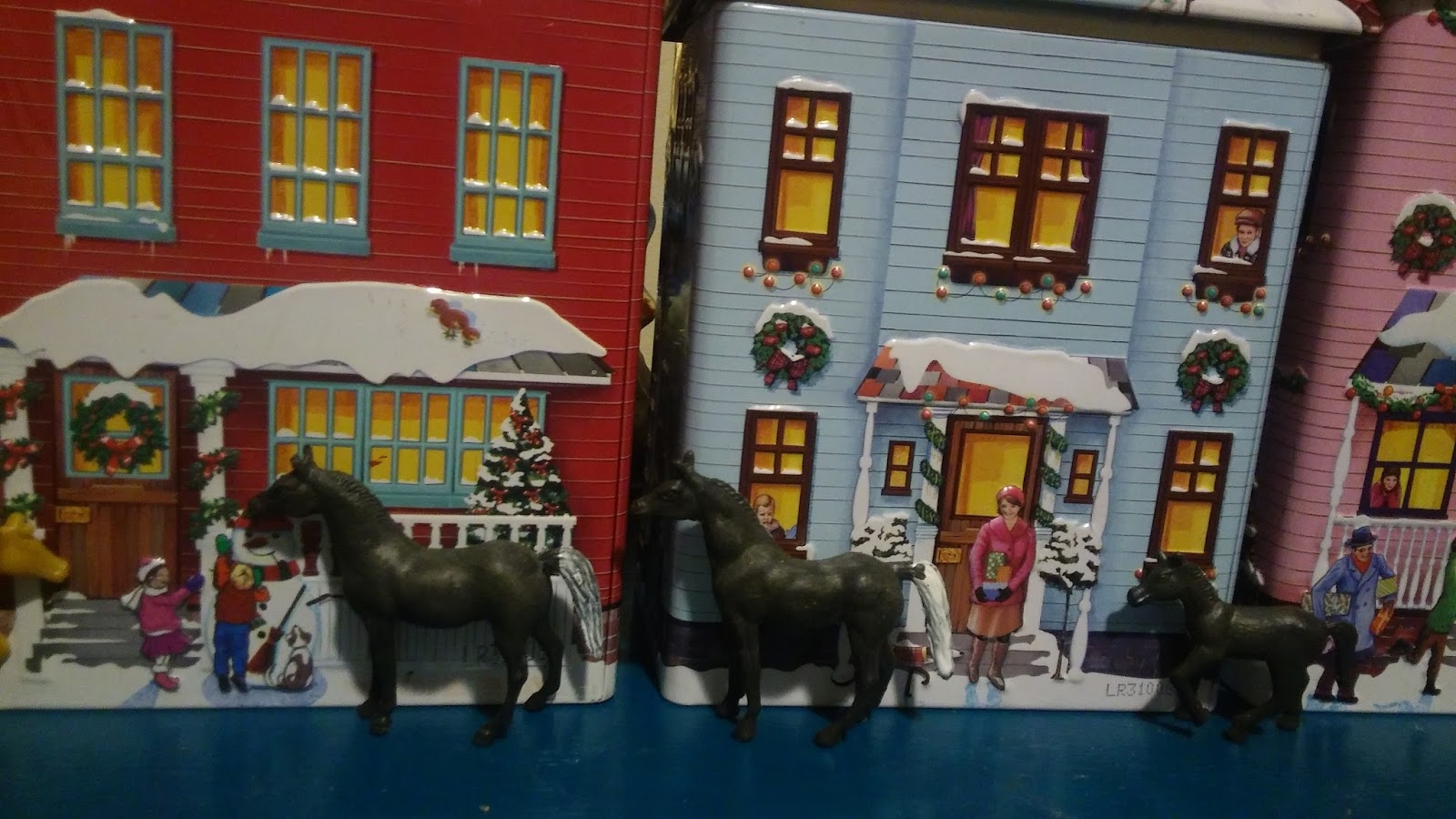 I have a few of these tin cannisters/containers that came with candy in them, I think?...years ago. I kept them and display them every Christmas because I love the pretty bright scenes on every side of them. They are shaped like Victorian houses. They have also been WELL PLAYED WITH by two little granddaughters by now! Thats a salt and pepper shaker snowman in front of them below: