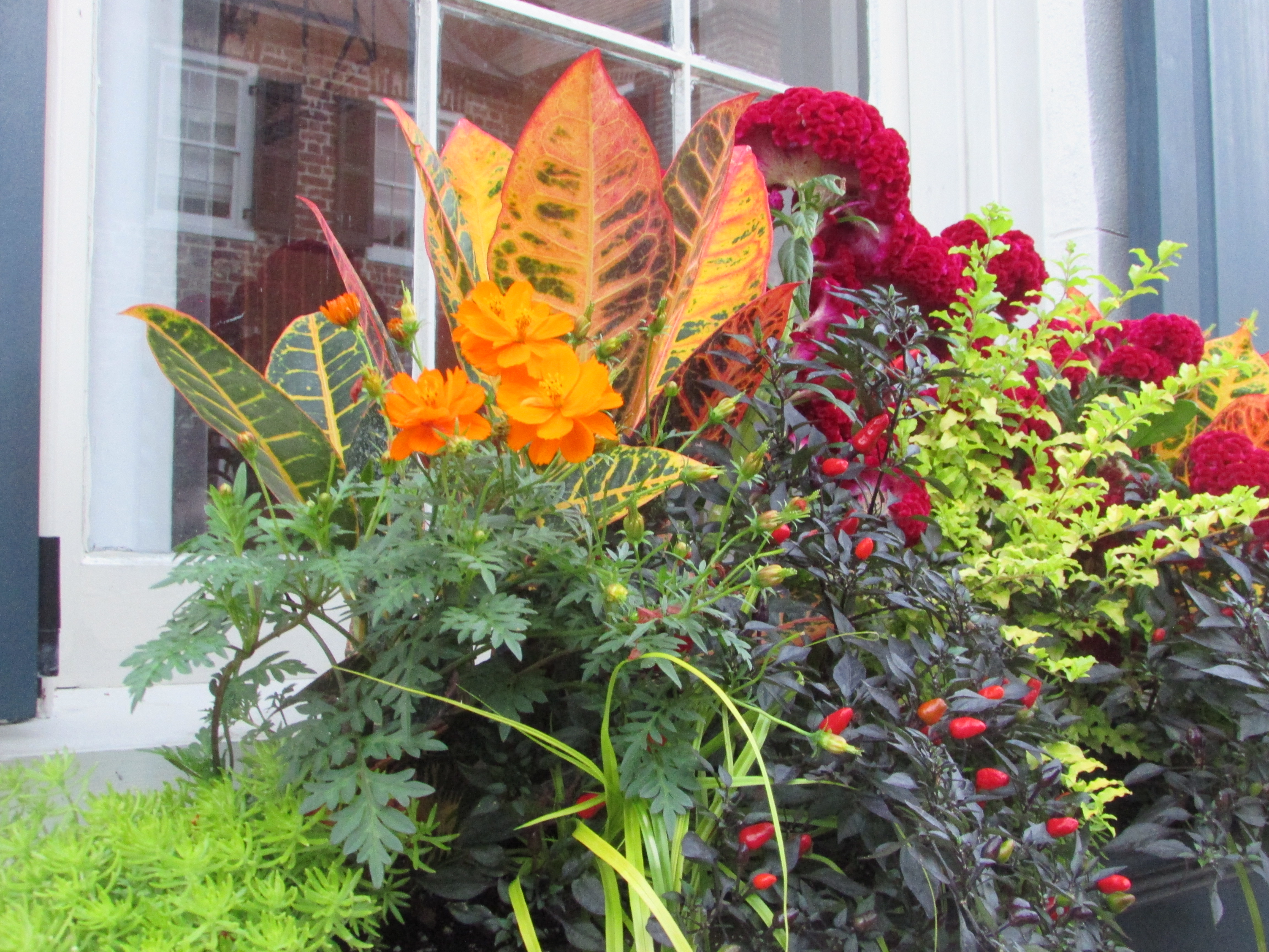 Lots of bright blooms! and pumpkins scattered everywhere, on windowsills and on porches and dressing up steps