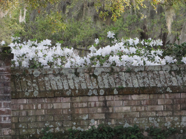 | Snowy white azaleas peeking over the brick cemetery walls |